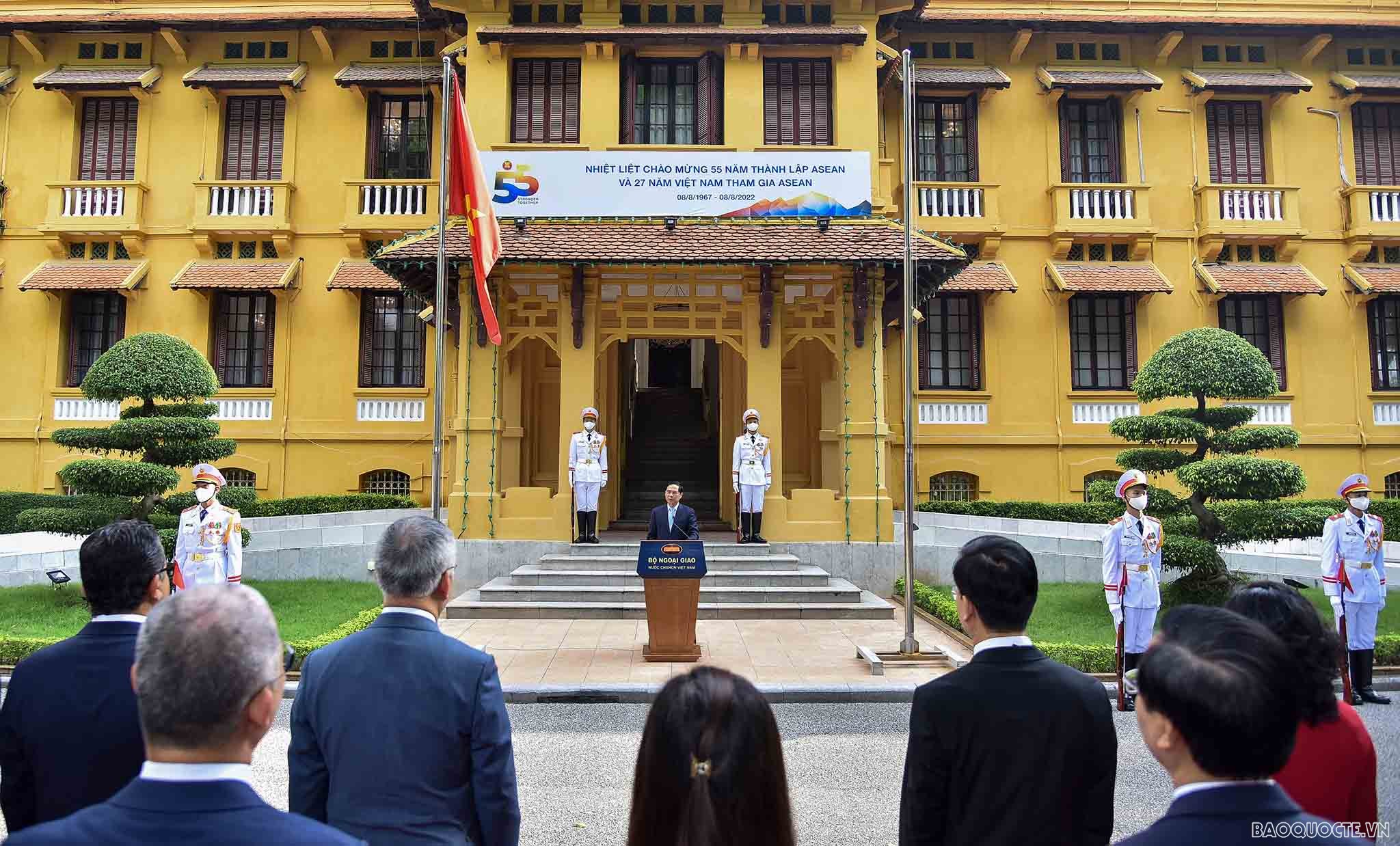 | Minister of Foreign Affairs Bui Thanh Son delivers his remarks at the flag raising ceremony to celebrate the 55th founding anniversary of ASEAN at the headquarters of the Ministry of Foreign Affairs on August 8. (Photo: Nguyen Hong) |
