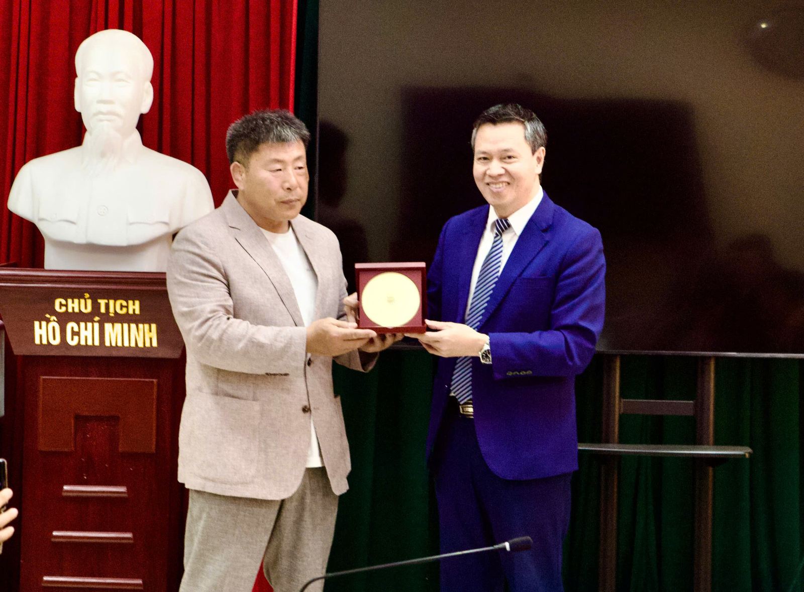 ông Dư Văn Quảng, Phó Giám đốc Sở Ngoại vụ, Chủ tịch Liên hiệp các tổ chức hữu nghị tỉnh tặng biểu tượng trống đồng cho đại diện tỉnh Chungcheongbuk