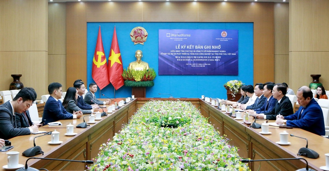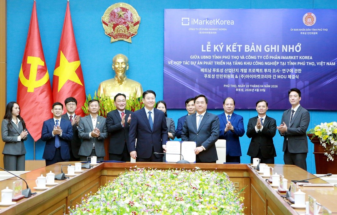 Trước đó, vào chiều ngày 20/4/2026, tại trụ sở UBND tỉnh, đồng chí Trần Duy Đông - Ủy viên dự khuyết Ban Chấp hành Trung ương Đảng, Phó Bí thư Tỉnh ủy, Chủ tịch UBND tỉnh và ông Kim Hak Jae - Tổng Giám đốc Công ty iMarket Korea đồng chủ trì buổi làm việc và ký kết Bản ghi nhớ giữa UBND tỉnh Phú Thọ và Công ty Cổ phần iMarket Korea về nghiên cứu, khảo sát đầu tư Dự án phát triển hạ tầng khu công nghiệp tại tỉnh Phú Thọ.